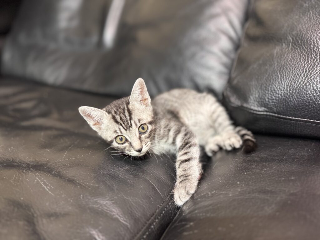 銀色の体に黒い縞模様のサバトラです。